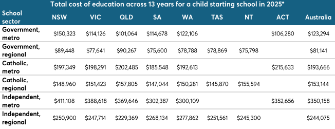 *Estimates of future long-term education costs projected over a 13-year period are provided as a guide only and are population-weighted. Being estimates, the actual cost of education for a particular child or school sector or period cannot be guaranteed.